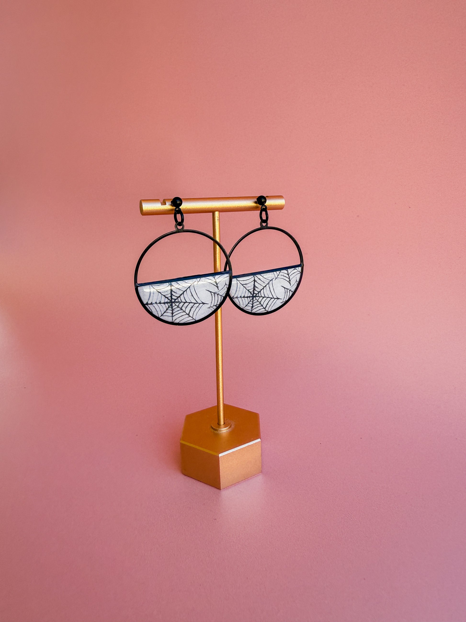 Elevate your Halloween accessory game with our Spooky Spiderweb Pattern Earrings. These fun earrings include a striking half-circle earring and an adorable ghost, both featuring captivating spiderweb patterns. The half circle is crafted from sleek black brass and coated in resin for extra durability, but all three of these earrings are perfect for making a 👻statement without feeling heavy!